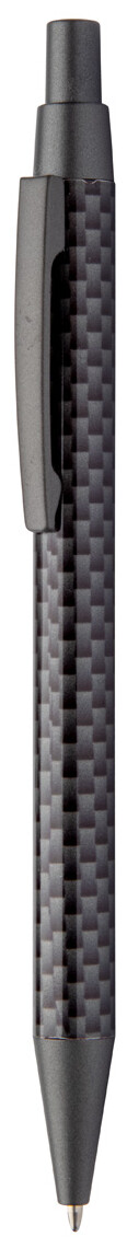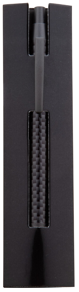 Kovové kuličkové pero s karbonovým vzorem na těle, v černém papírovém pouzdře, s modrou náplní.