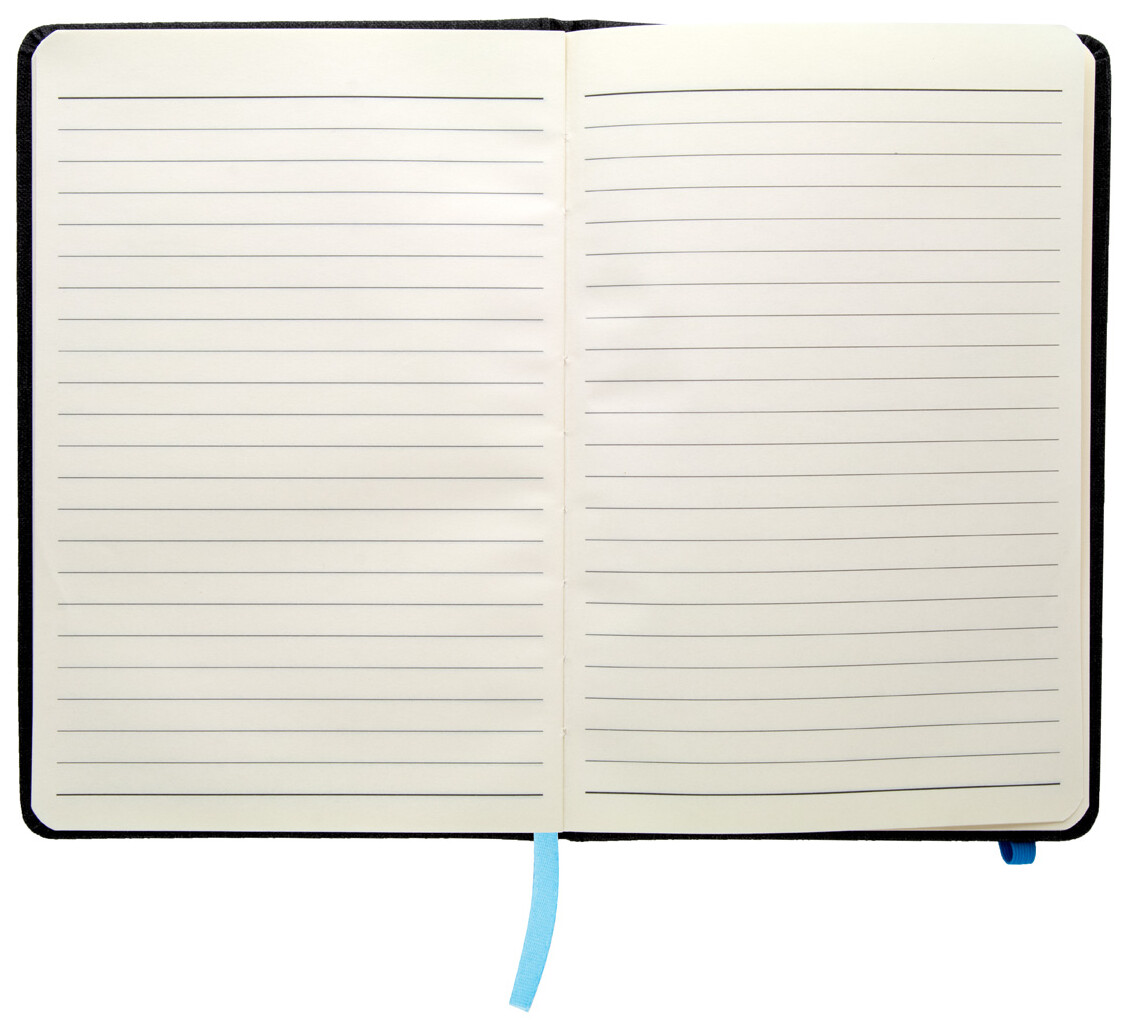 Texturovaný blok A5, potažený PU kůží se záložkou, gumičkou a držákem pera. 96 linkovaných listů.