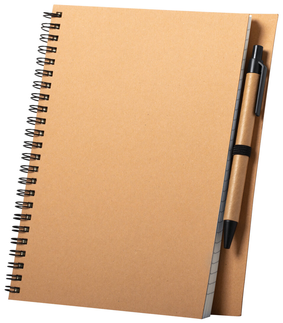 Blok A5 s deskami z recyklované lepenky se spirálou a 80 linkovanými listy. Vč. kuličkového pera z recyklovaného papíru a s modrou náplní.