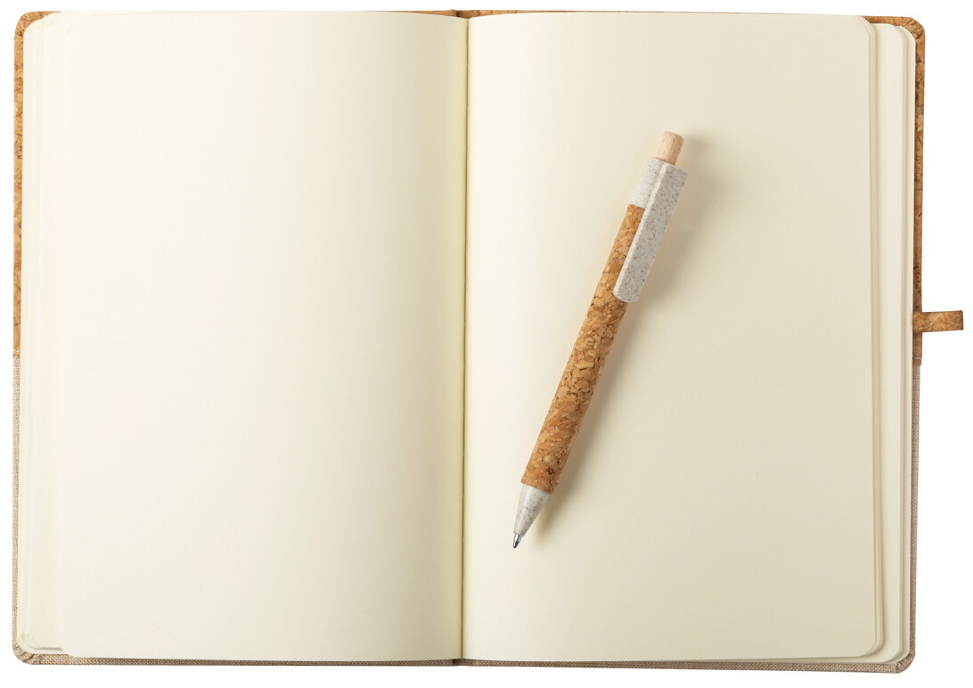 Blok A5 s deskami z přírodního korku a bavlny a 80 čistými listy. Vč. kuličkového pera z korku a pšeničné slámy, s černou náplní.