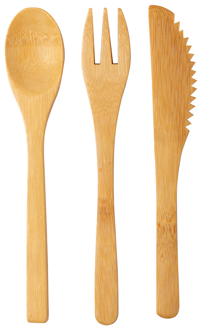 Sada 3ks příborů z bambusu v bavlněném obalu.