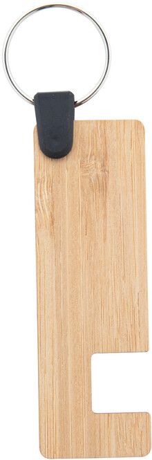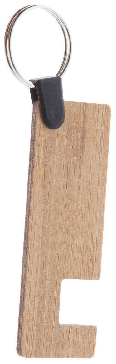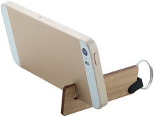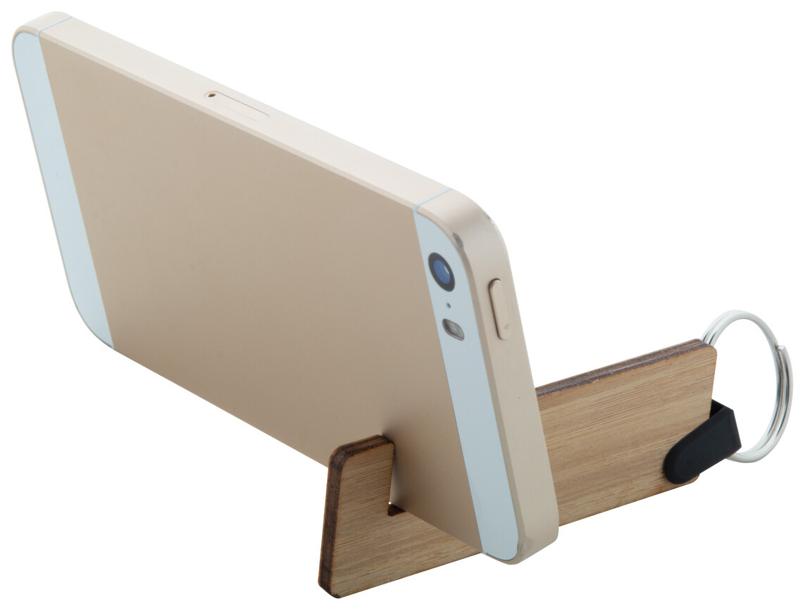 Stojánek na mobil z bambusové překližky s kovovým přívěškem na klíče.