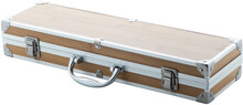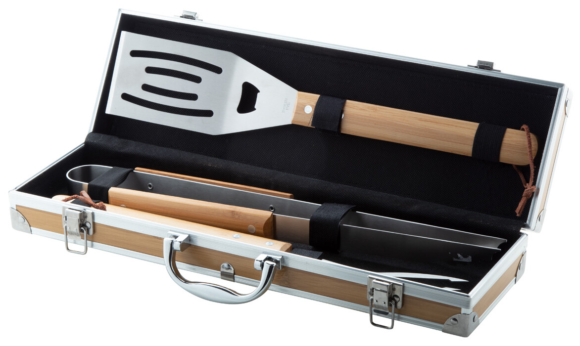 Sada na grilování z nerez oceli a s bambusovou rukojetí (vidlička, kleště a obracečka s otvírákem na lahve). S bambusovým vzorem v hliníkovém pouzdře.