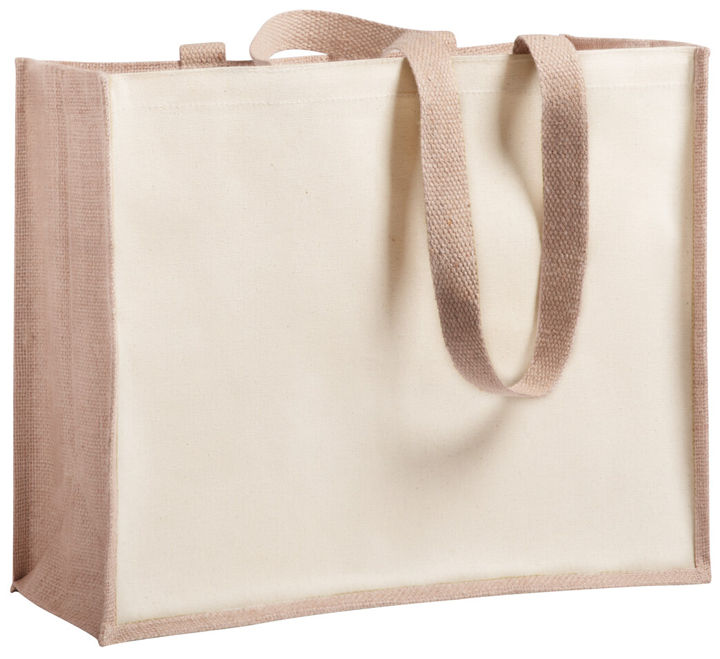 Nákupní taška v kombinaci z laminované juty a laminované bavlny s dlouhými uchy.