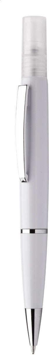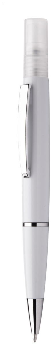 Plastové kuličkové pero s modrou náplní a dezinfekčním sprejem ve vršku. Kapacita: 3 ml. Dodáváno bez dezinfekční kapaliny.