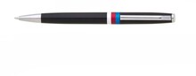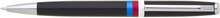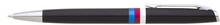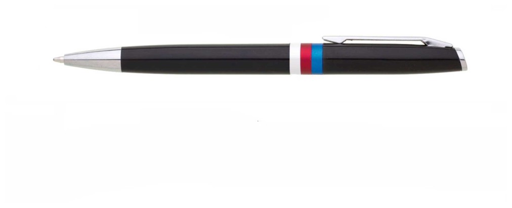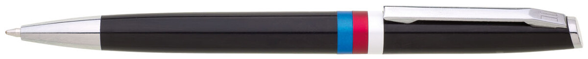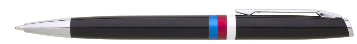 Černá otočná propiska s trikolórou a tiskem lva. Náplň velkoobsahová, modře píšící.