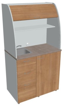 Dvě police ve vrchní části kuchyňky poskytují dostatečnou kapacitu pro vaše skleničky, hrnky či talíře. Na pracovní desku můžete umístit např. kávovar a kabelovou průchodkou v zadní části vyvedete přívodní kabel z prostoru kuchyňky.