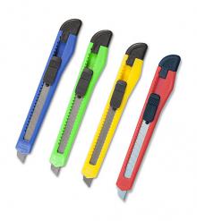Odlamovací nůž s plastovým tělem, mix barev, možnost výměny nožů, uzavírací pojistka, protiskluzový povrch, šířka čepele 9 mm. Délka 13 cm.
