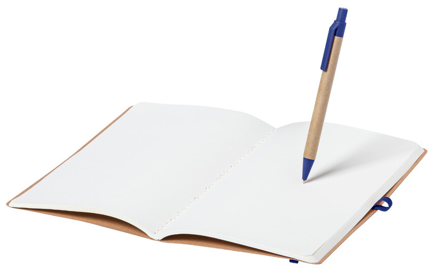 Blok A5 z recyklovaného kartonu s 60 čistými listy a barevnou gumičkou. Včetně plastového kuličkového pera z pšeničné slámy s modrou náplní.