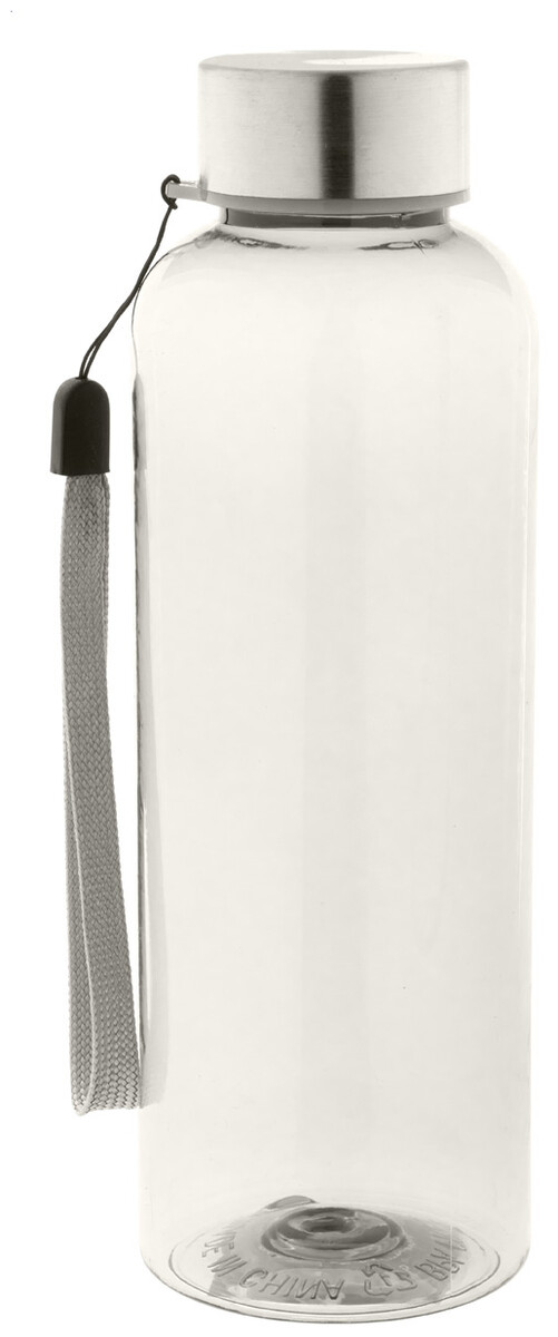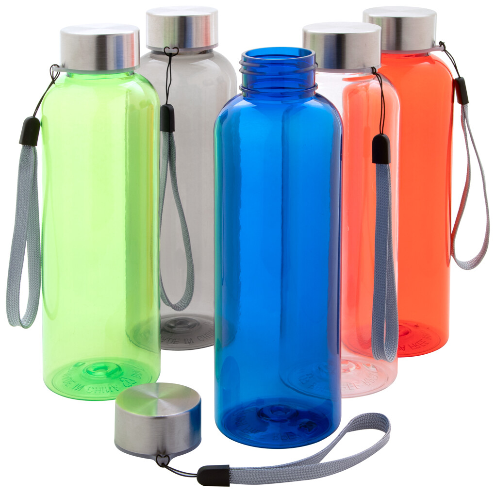 RPET láhev s nerezovým uzávěrem a popruhem, 500 ml. Bez BPA. Nevhodné pro sycené nápoje.