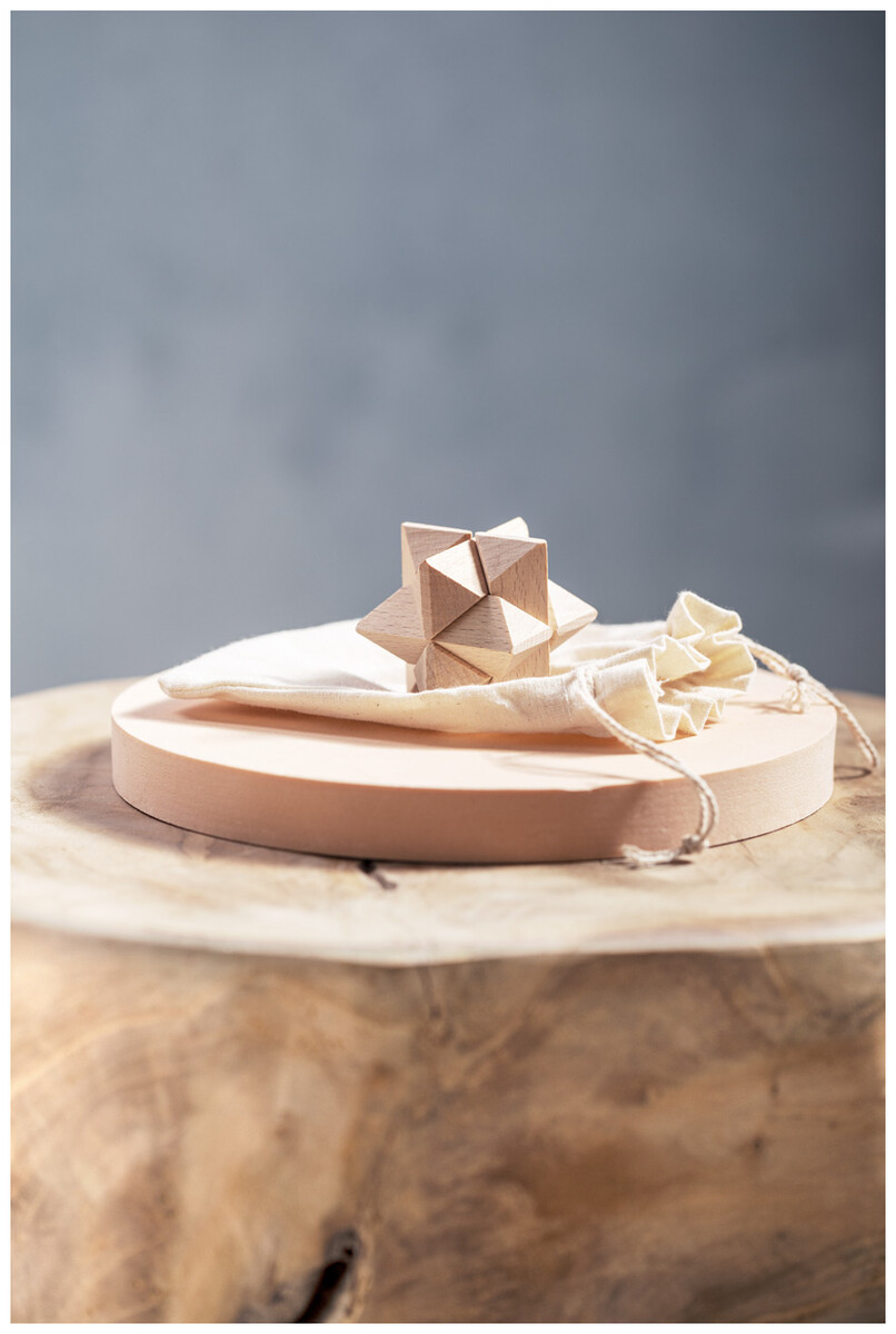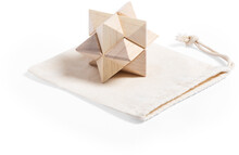 Dřevěný hlavolam v bavlněném pytlíku na stažení šňůrkou.