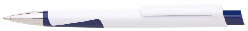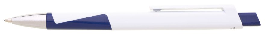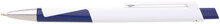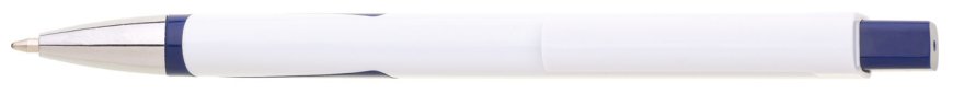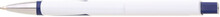 Plastová bílá propiska CARRE se čtvercovým profilem a modrýmii doplňky. Ideální na uv potisk. Náplň velkoobsahová, modře píšící.