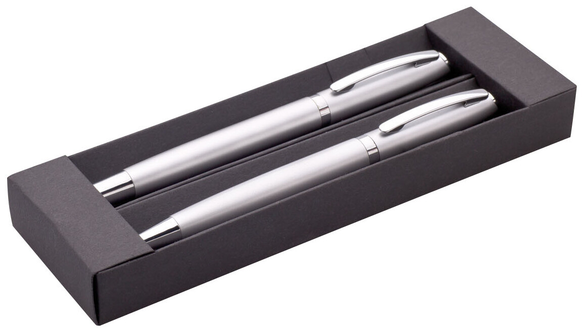 Dárková sada se stříbrnou propiskou a rollerem v černé papírové krabičce.