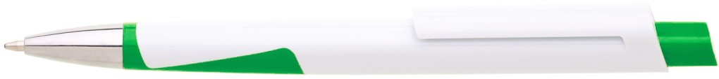 Plastová bílá propiska CARRE se čtvercovým profilem a zelenými doplňky. Ideální na uv potisk. Náplň velkoobsahová, modře píšící.