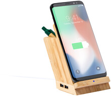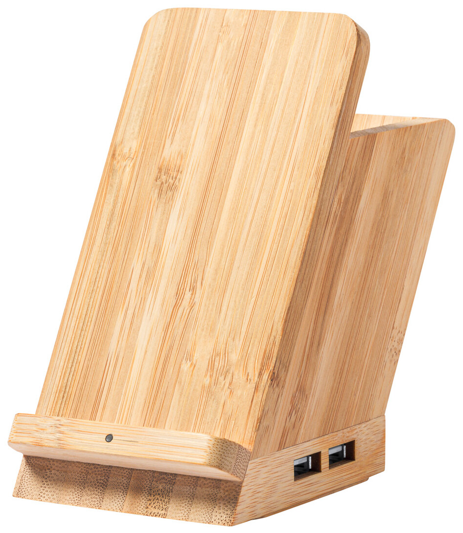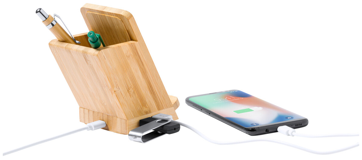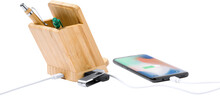 Multifunkční bambusový stojánek na pero s držákem na mobilní telefon, bezdrátovou nabíječkou (5W) a 4portovým USB hubem (USB 2.0). Včetně USB kabelu.