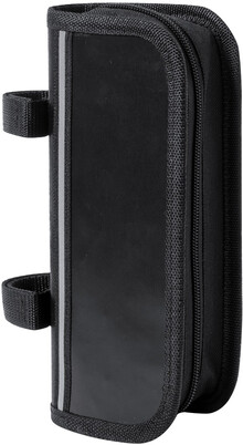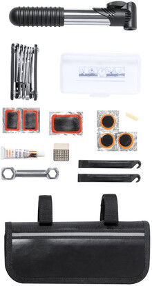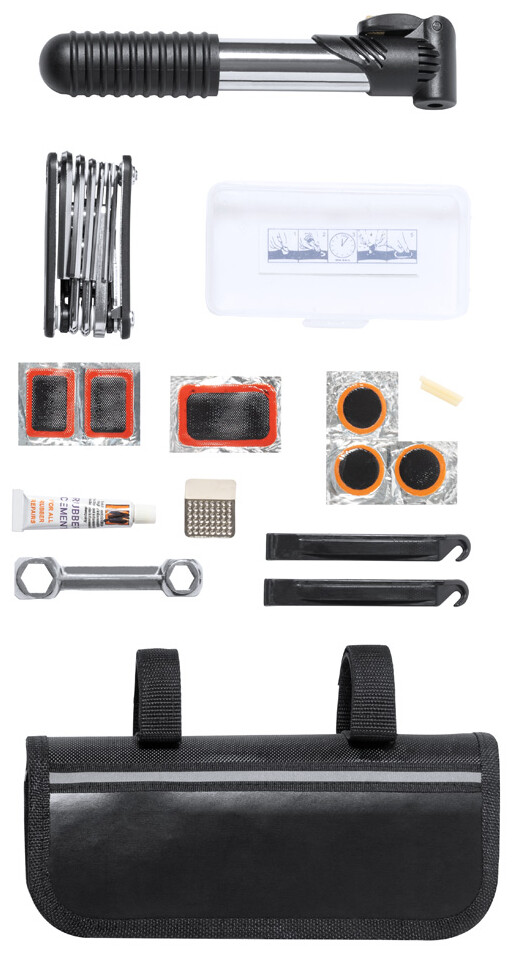 Sada na opravu jízdního kola v praktické tašce na rám kola. Včetně: 15 funkcí multifunkčního nářadí, šestihranného klíče, mini pumpy a sady na opravu defektu (2 páčky na pneumatiky, struhadlo a 6 záplat). 600D polyester.