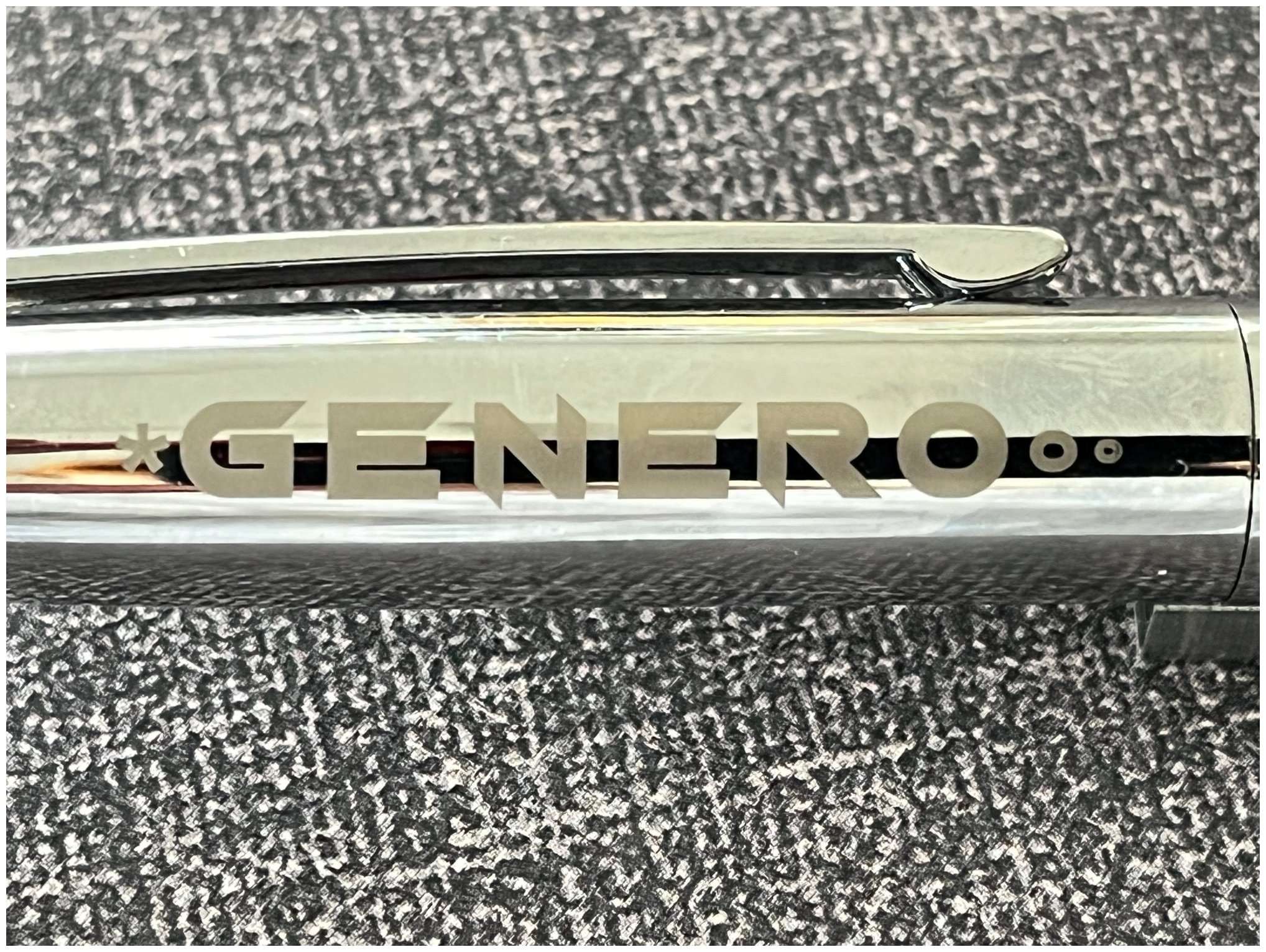 Elegantní kovová otočná propiska Genero s černou spodní a stříbrnou vrchní částí. Laser na propisce je šedo-hnědý. Kolekce Gabrielis.