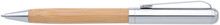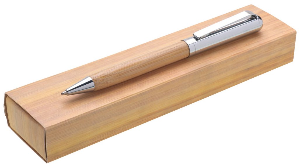 Otočná kovová propiska s bambusovou úchopovou částí. Součástí výrobku je papírová krabička.