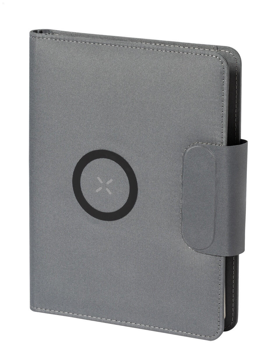 Polyesterová sloha na dokumenty A5 z 300D RPET se zápisníkem na 65 řádků, vestavěnou magnetickou bezdrátovou rychlonabíječkou (10W), power bankou 5000 mAh s portem pro nabíjení USB a skládacím držákem na mobil. Včetně samolepícího kovového kroužku pro použití magnetické funkce na jakémkoli bezdrátově nabíjecím zařízení. Včetně USB nabíjecího kabelu.