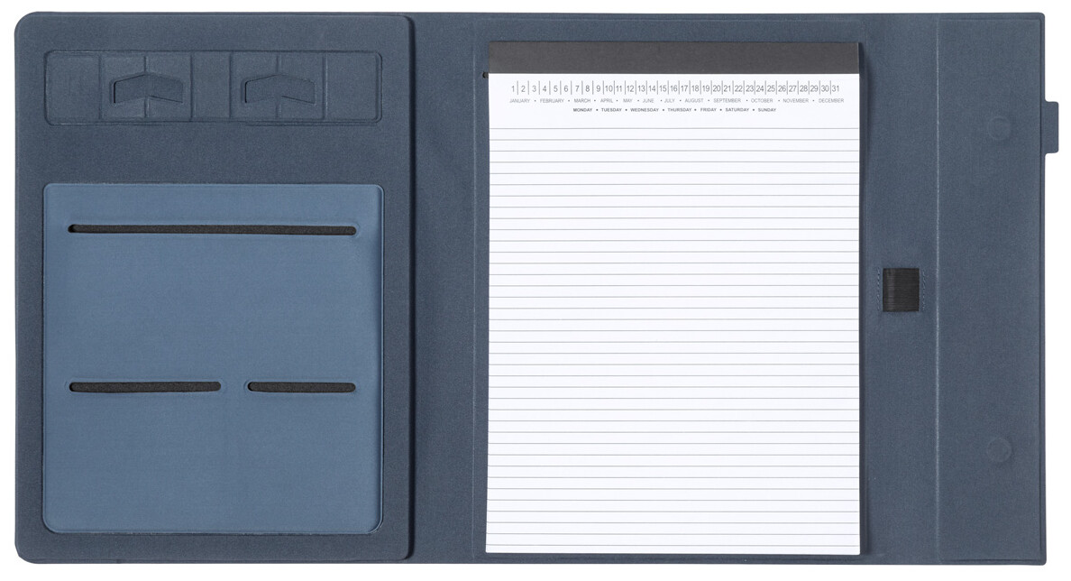 Polyesterová sloha na dokumenty A4 z 600D RPET s magnetickým zavíráním, skládacím držákem na mobil a poznámkovým blokem na 20 linkovaných listů. S výrazným štítkem RPET.