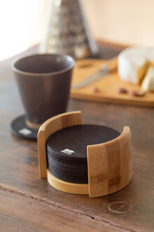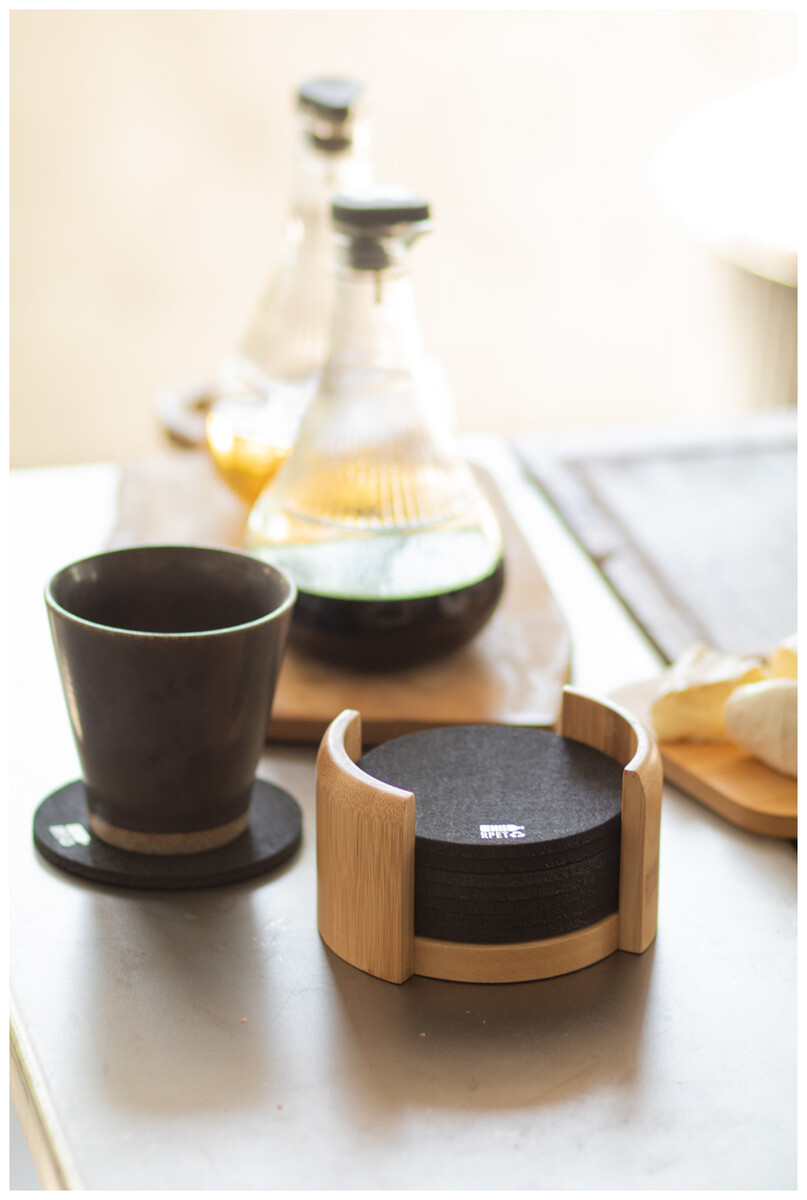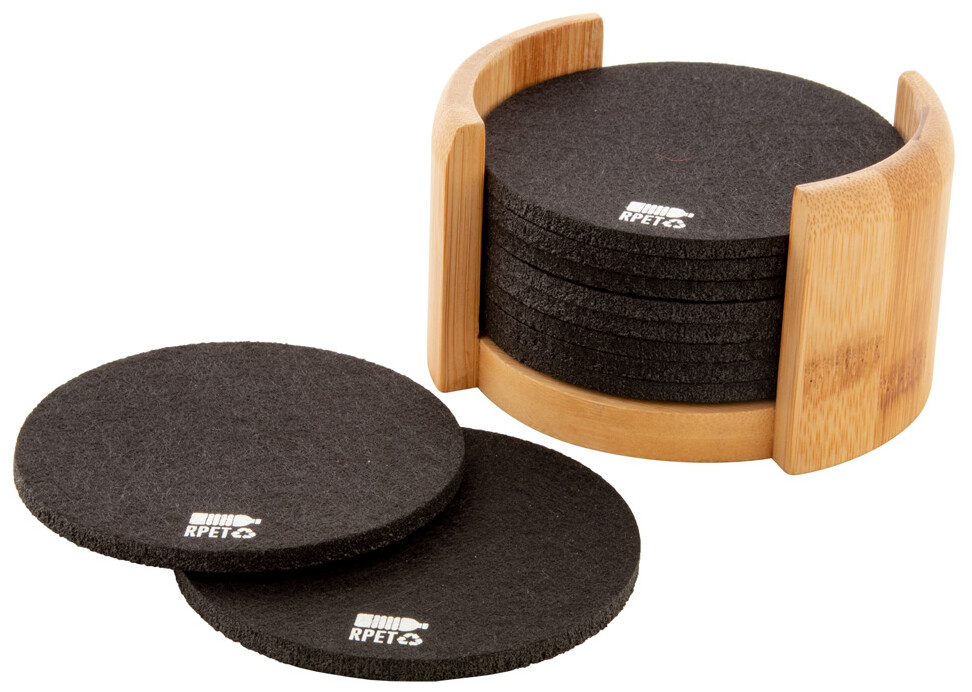 Sada 10 ks RPET filcového podtácku v bambusovém držáku na stůl. S výrazným logem RPET na každém tácku.