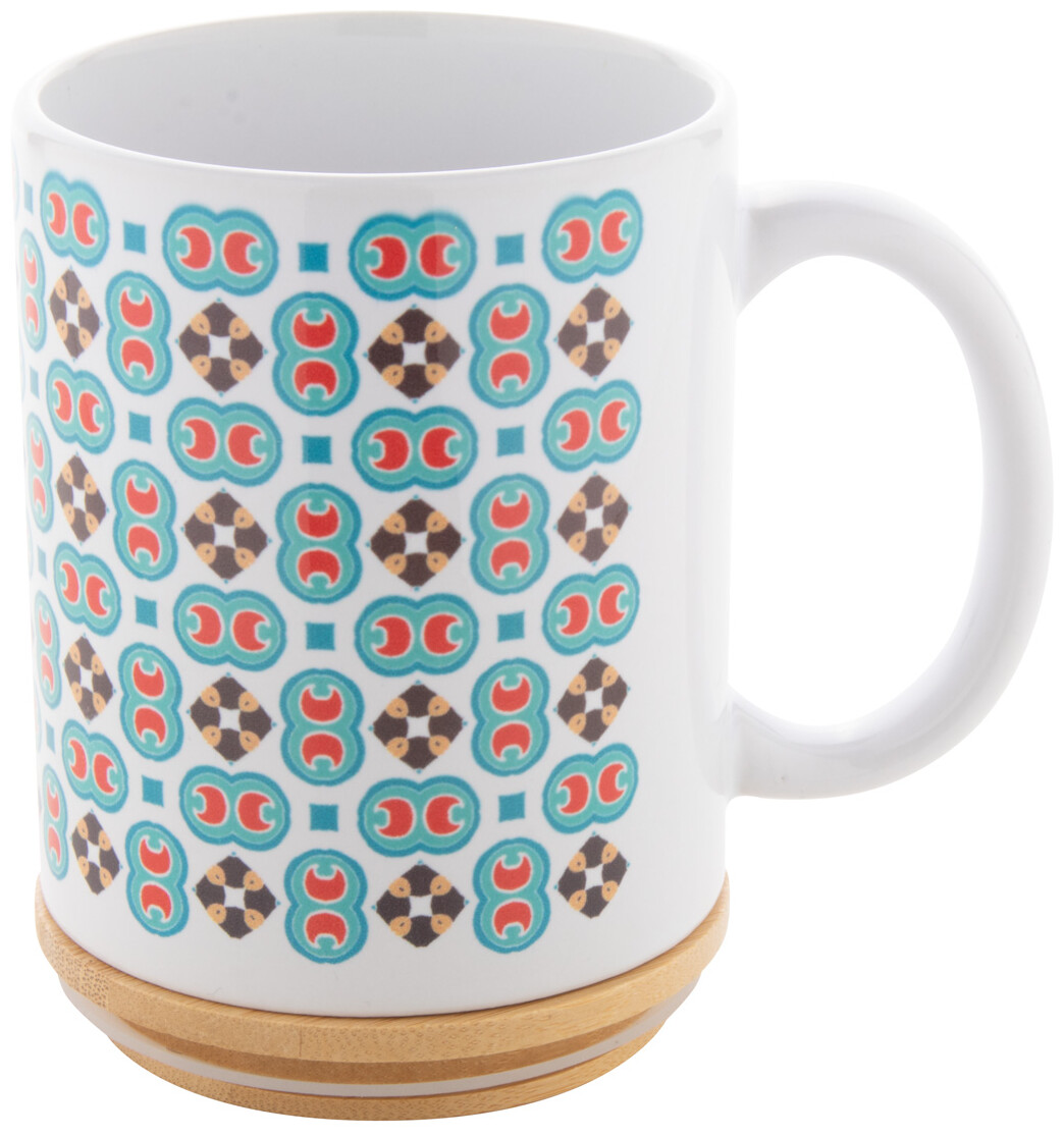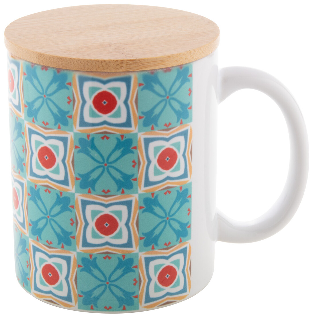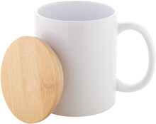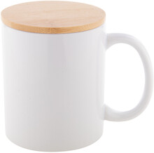 Bílý keramický hrnek s bambusovým víčkem pro sublimační potisk vhodný do myčky na nádobí, 300 ml. V kraftové papírové krabici.