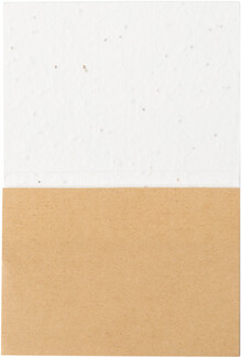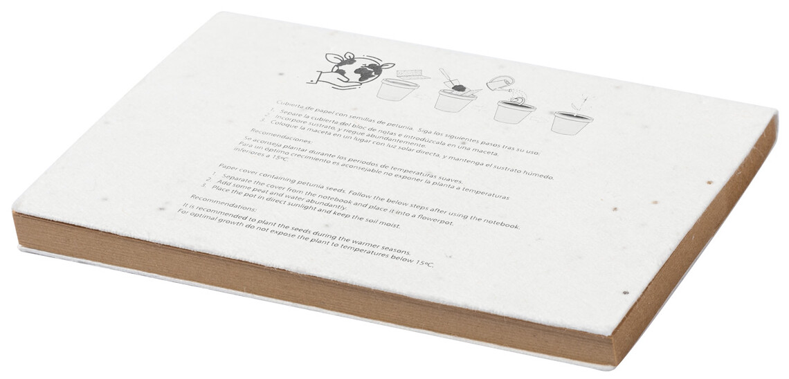 Poznámkový blok z recyklovaného kraftového papíru potažený papírem se semínky s 50 samolepícími lístky. Obal papíru se semínky obsahuje semena petúnie v různých barvách, která lze zasadit oddělením obalu od poznámkového bloku.