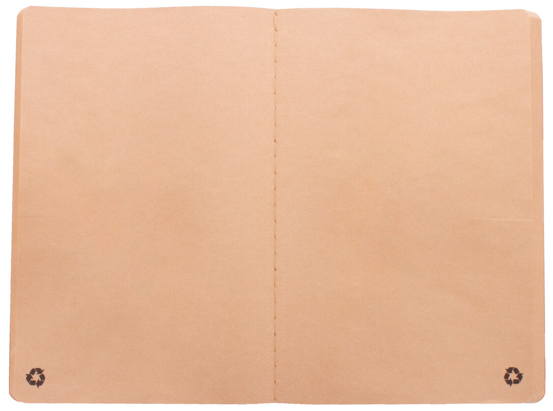 Blok A5 s deskami z recyklovaného papíru, šitý a 60 prázdnými listy z recyklovaného kraftového papíru.