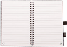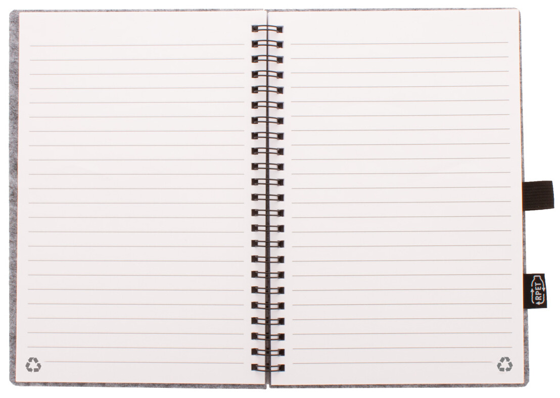 Spirálový blok A5 potažený RPET plstí s výrazným štítkem RPET a 80 linkovanými listy z recyklovaného papíru.