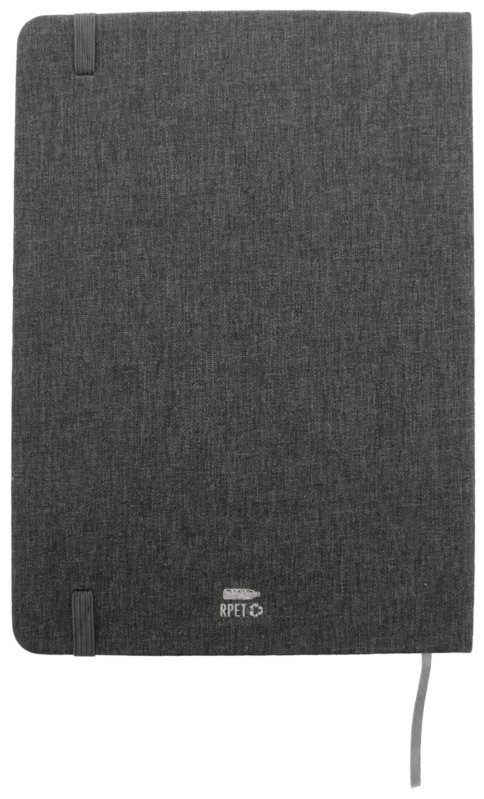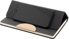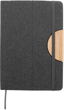 Blok A5 s deskami potaženými polyesterem RPET s bambusovou vložkou a funkcí držáku na mobil. S 80 linkovanými listy z recyklovaného papíru, záložkou a gumičkou.