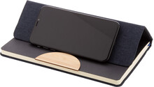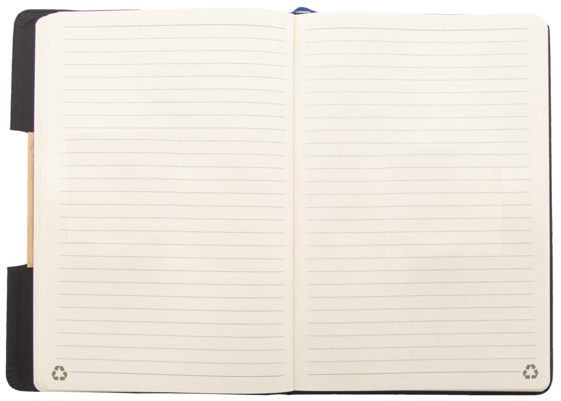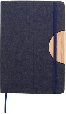 Blok A5 s deskami potaženými polyesterem RPET s bambusovou vložkou a funkcí držáku na mobil. S 80 linkovanými listy z recyklovaného papíru, záložkou a gumičkou.