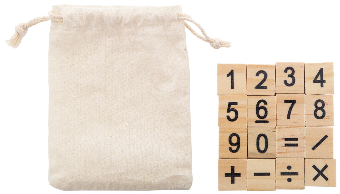 Dřevěná vzdělávací hra na počítání v bavlněném sáčku se stahovací šňůrkou. S 32 dílky, včetně čísel a matematických operací.