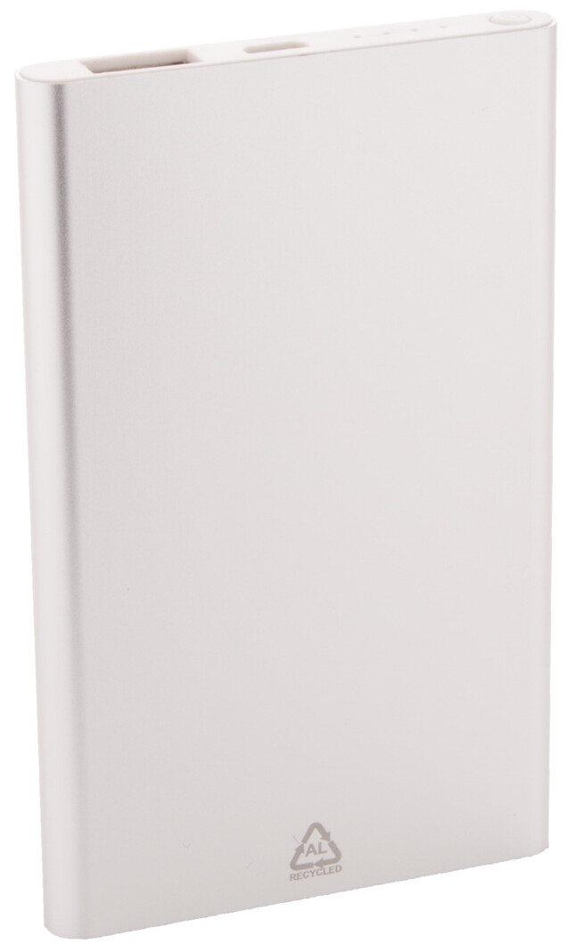 USB power banka v pouzdře z recyklovaného hliníku s 4000 mAh baterií. S 1 portem USB a 1 portem USB-C pro nabíječku. Vstupní port USB-C. Včetně USB nabíjecího kabelu.