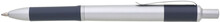 Propiska s matným stříbrným tělem a doplňky má tmavě modrý úchyt a zadní část těla. Náplň X20, modře píšící.