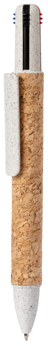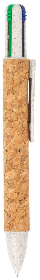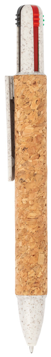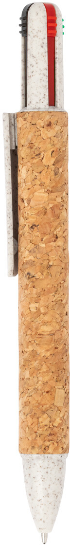 Ekologické plastové kuličkové pero z pšeničné slámy s pouzdrem potaženým přírodním korkem. Se 4 barevnými náplněmi: černá, modrá, zelená a červená.