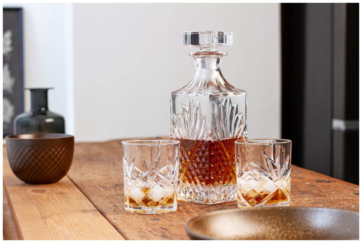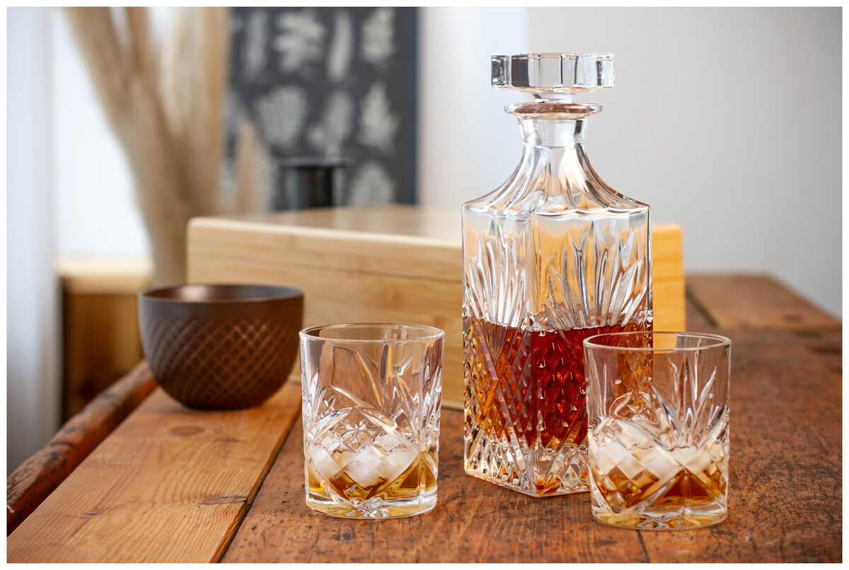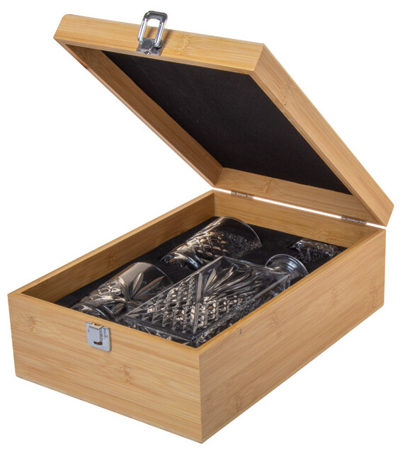Luxusní whisky set v bambusové krabičce se skleněnou karafou (750 ml) a dvěma skleničkami na whisky (280 ml).