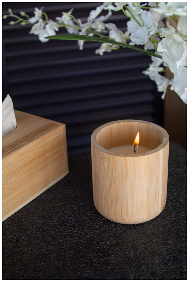 Rostlinná vosková svíčka s vůní vanilky v bambusovém držáku. Se 160 gramy vosku. V kraftové papírové krabici.