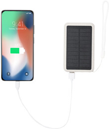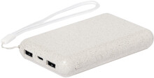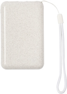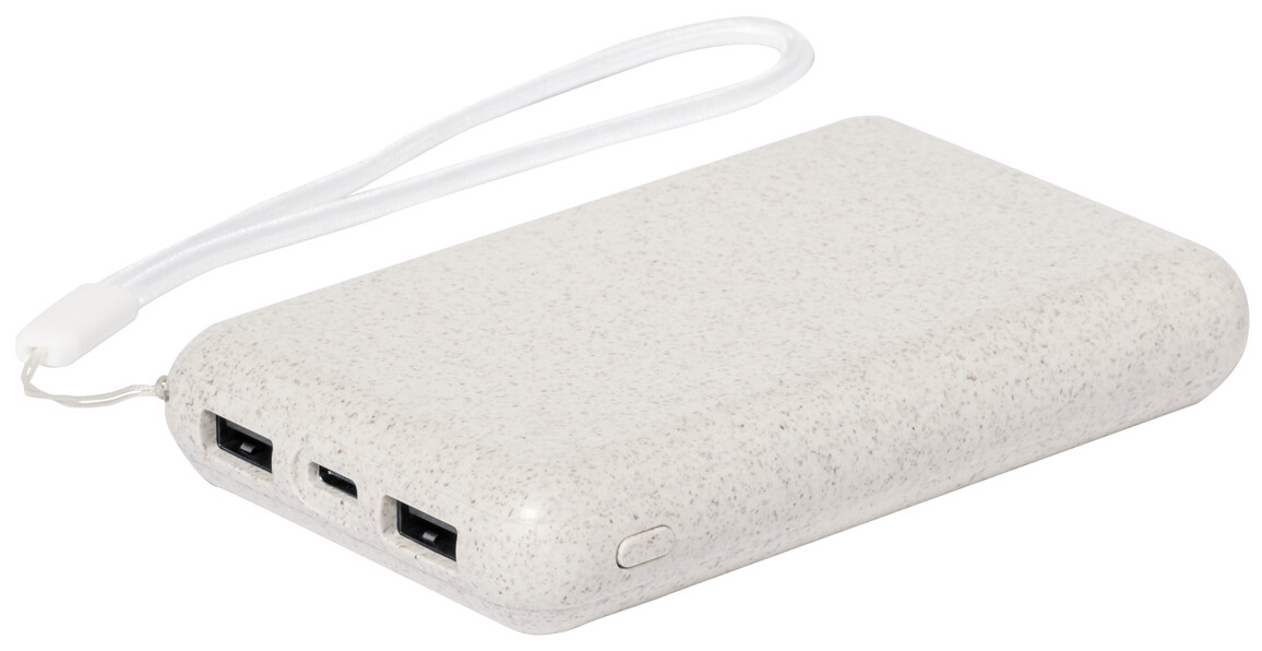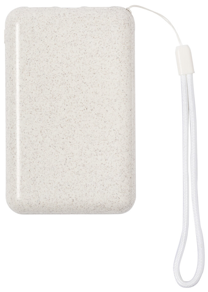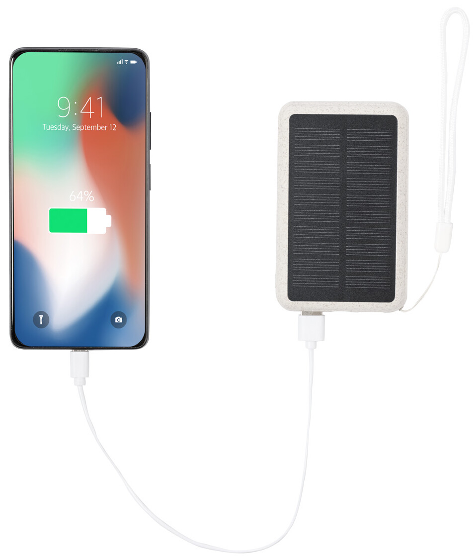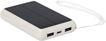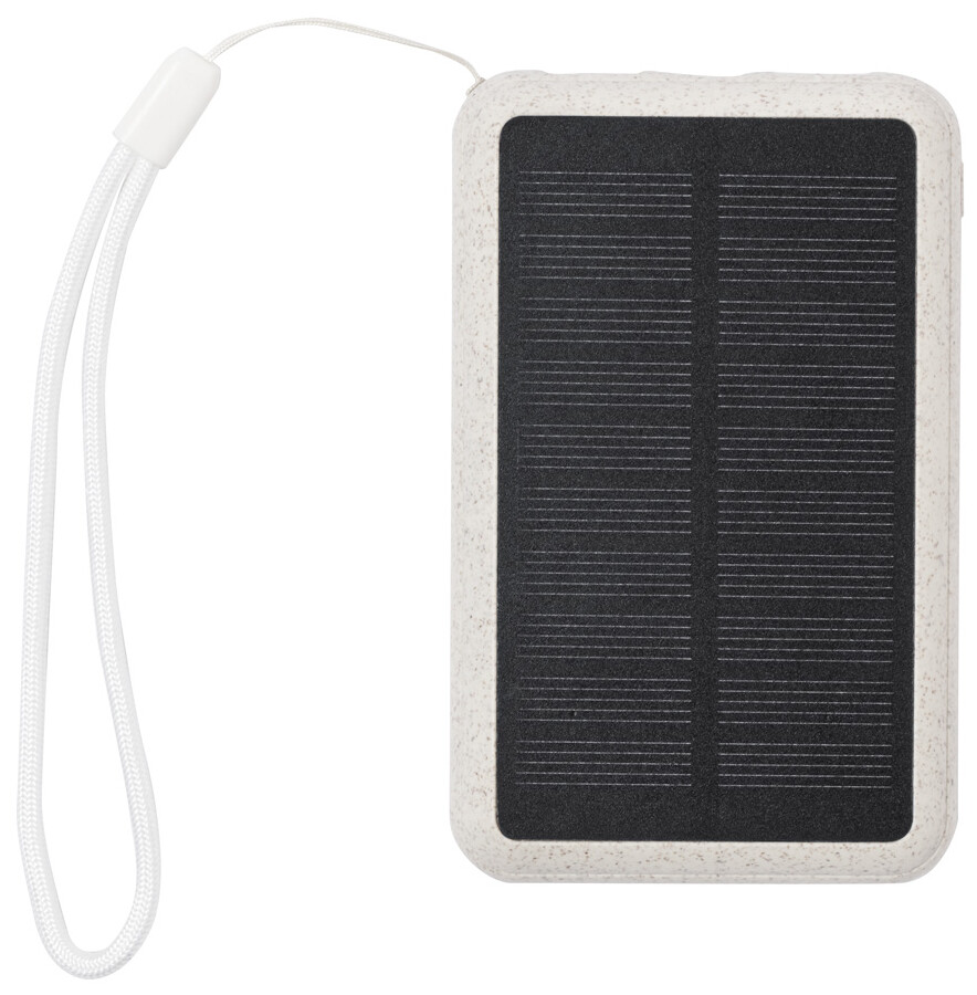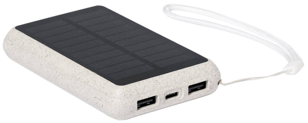 USB power banka v ekologickém plastovém pouzdře z pšeničné slámy se zabudovanou solární nabíječkou a 5000 mAh baterií. Se 2 porty USB a 1 portem USB-C pro nabíječku. Vstupní port USB-C.