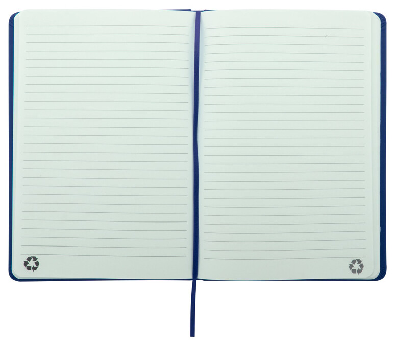 Blok potažený recyklovanou PU kůží se 100 linkovanými listy z recyklovaného papíru. Se záložkou v odpovídající barvě a gumičkou. Velikost A5.