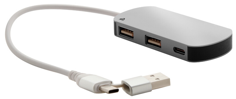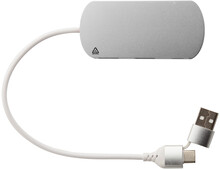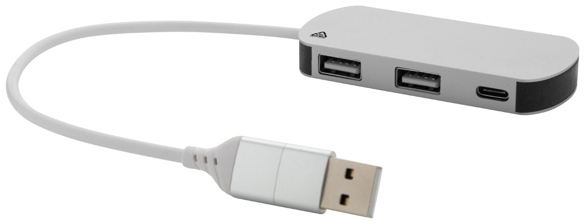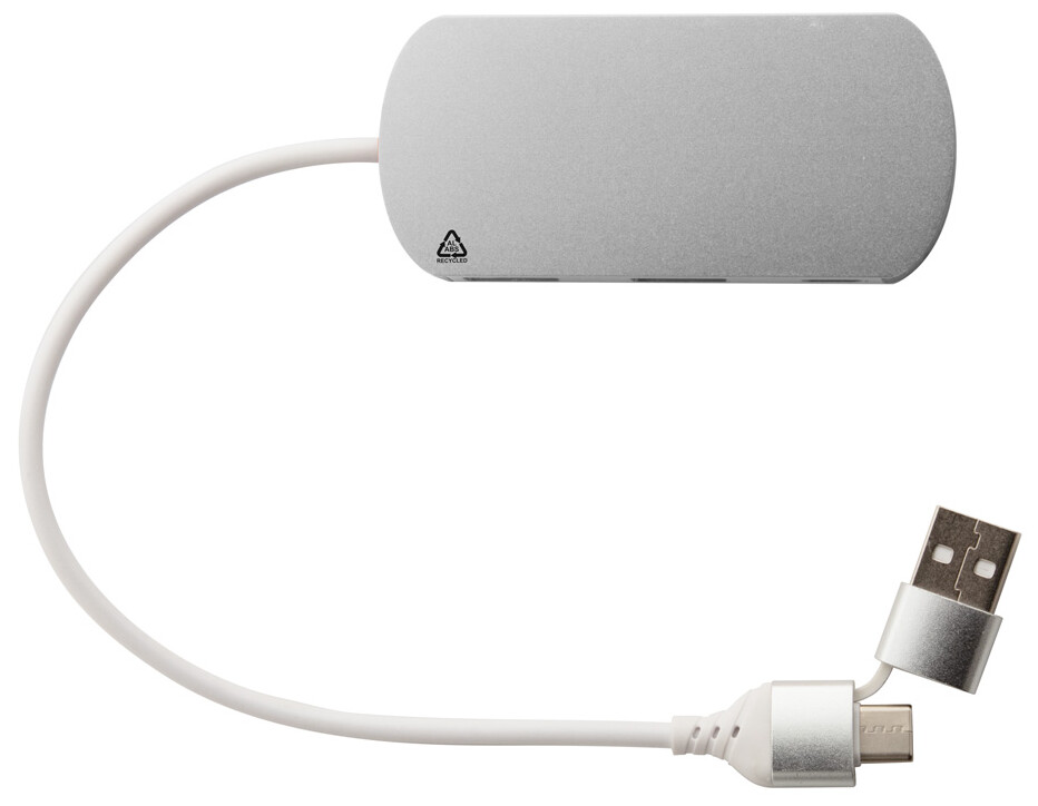 USB hub z recyklovaného hliníku a recyklovaného ABS se 2 USB a 1 USB-C portem, USB 2.0. Včetně kabelu s připojením USB a USB-C.