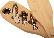 4 ks na víno z nerezové oceli v bambusové krabičce ve tvaru láhve. Včetně vývrtky, zátky, kroužku a nálevky.