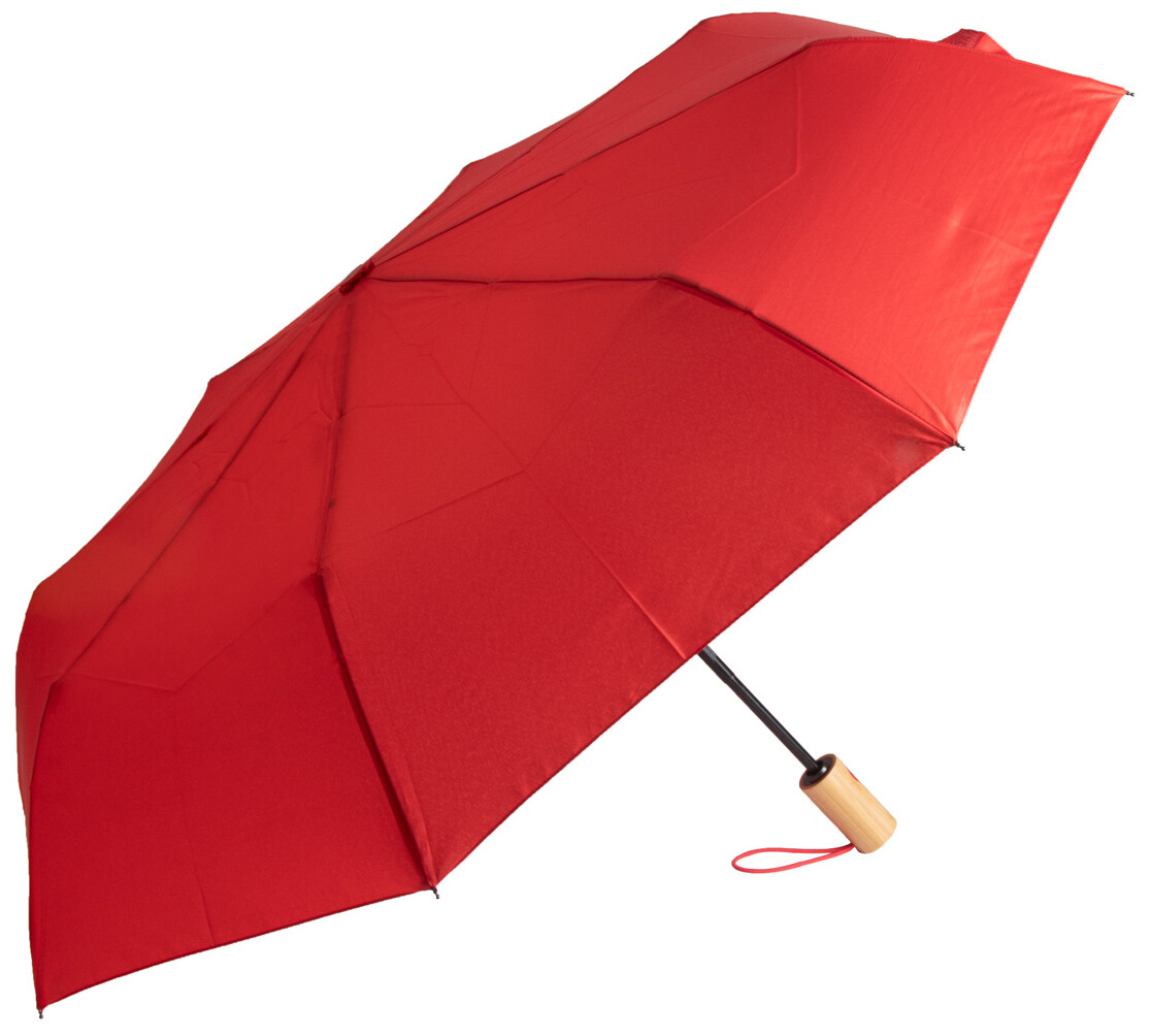 Plně automatický (otevřít/zavřít), větruodolný skládací deštník s 8 panely v pouzdře v odpovídající barvě. S kovovým rámem, sklolaminátovými žebry a bambusovou rukojetí. Pongee 190T RPET. S výrazným štítkem RPET.