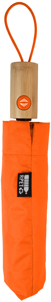 Plně automatický (otevřít/zavřít), větruodolný skládací deštník s 8 panely v pouzdře v odpovídající barvě. S kovovým rámem, sklolaminátovými žebry a bambusovou rukojetí. Pongee 190T RPET. S výrazným štítkem RPET.