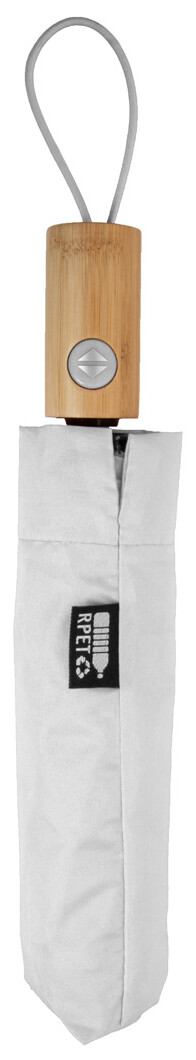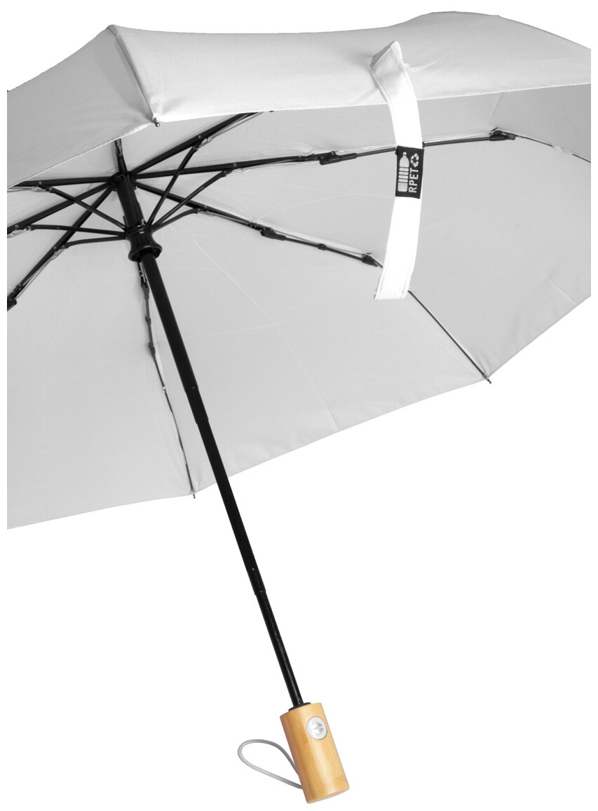 Plně automatický (otevřít/zavřít), větruodolný skládací deštník s 8 panely v pouzdře v odpovídající barvě. S kovovým rámem, sklolaminátovými žebry a bambusovou rukojetí. Pongee 190T RPET. S výrazným štítkem RPET.