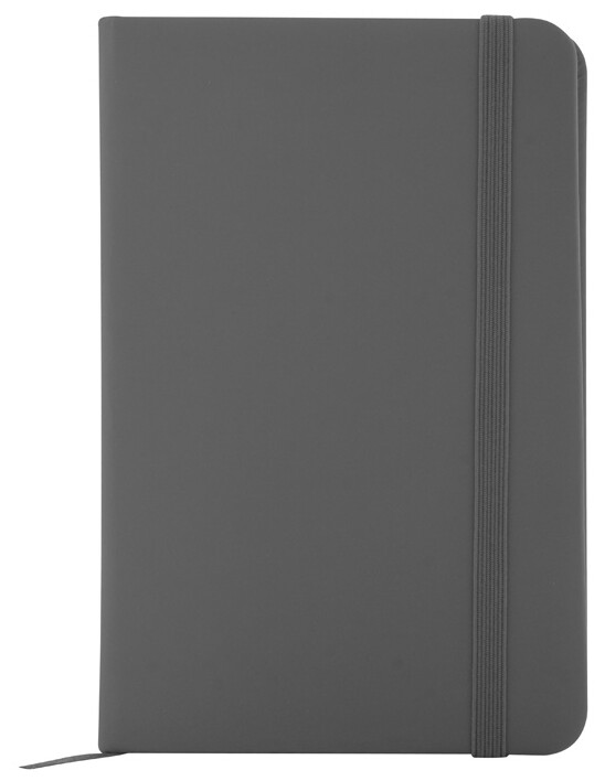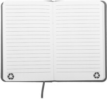 Blok potažený recyklovanou PU kůží se 100 linkovanými listy z recyklovaného papíru. Se záložkou v odpovídající barvě a gumičkou. Velikost A6.