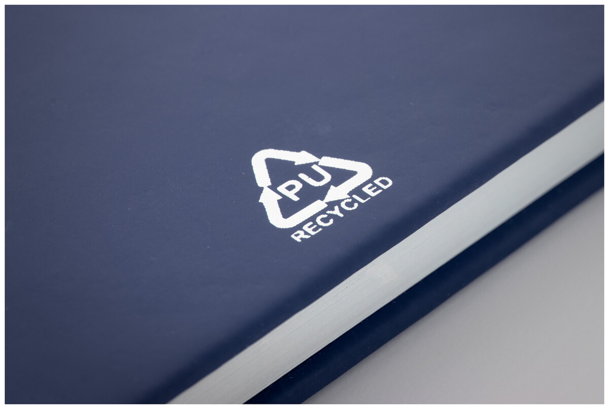 Blok potažený recyklovanou PU kůží se 100 linkovanými listy z recyklovaného papíru. Se záložkou v odpovídající barvě a gumičkou. Velikost A6.