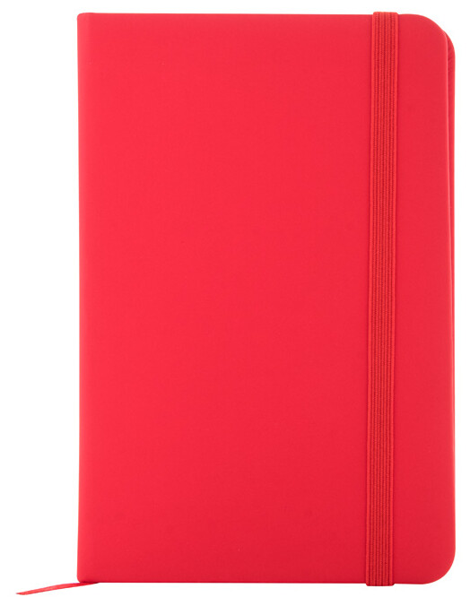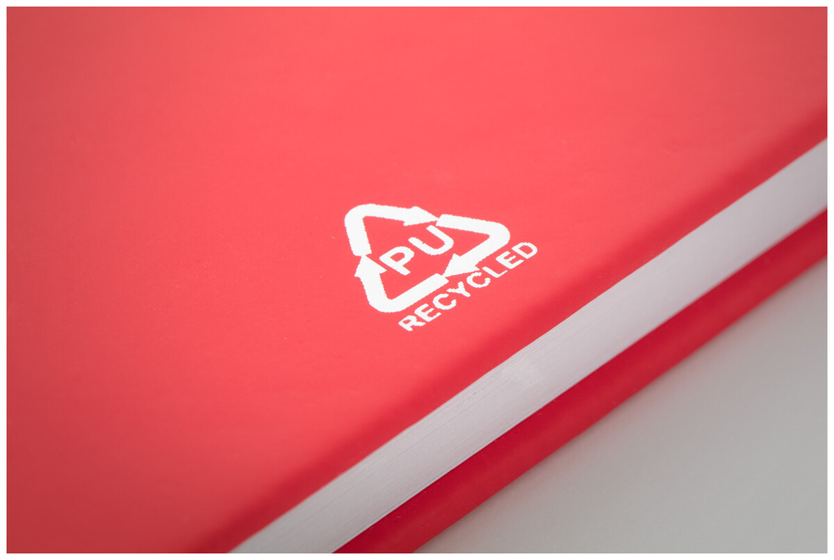 Blok potažený recyklovanou PU kůží se 100 linkovanými listy z recyklovaného papíru. Se záložkou v odpovídající barvě a gumičkou. Velikost A6.