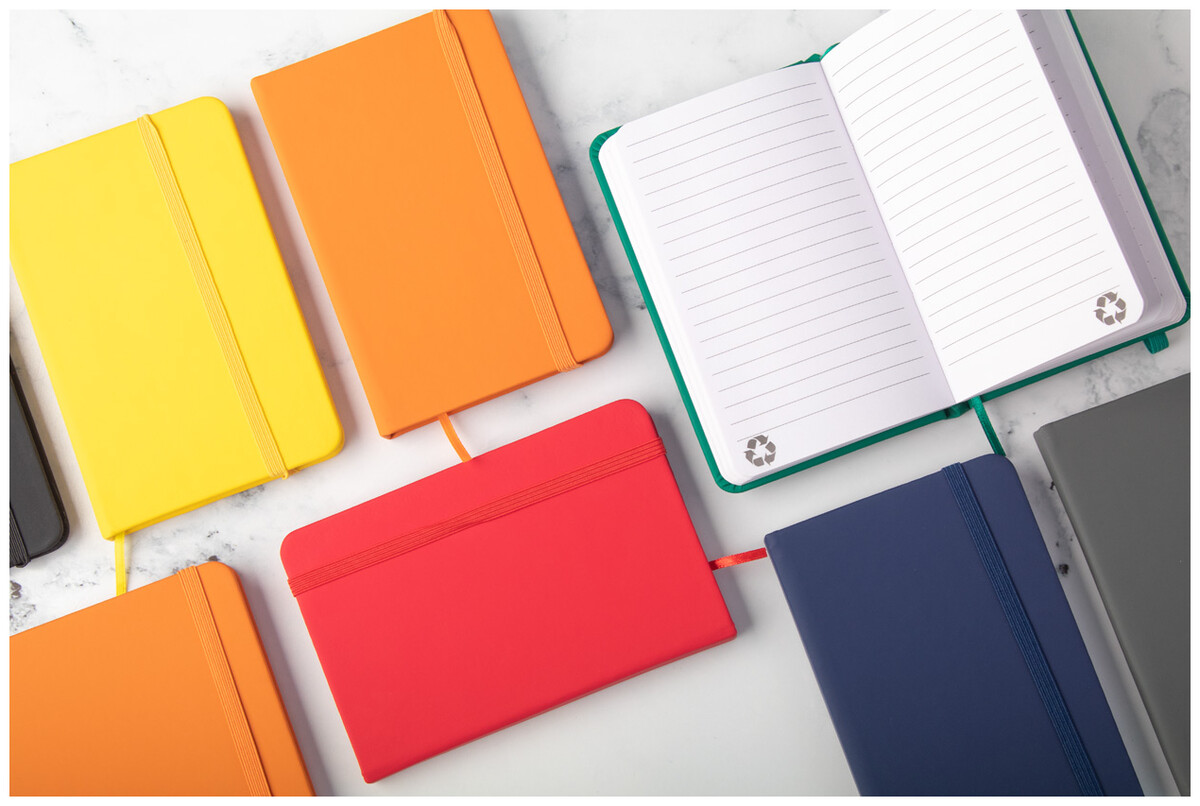 Blok potažený recyklovanou PU kůží se 100 linkovanými listy z recyklovaného papíru. Se záložkou v odpovídající barvě a gumičkou. Velikost A6.