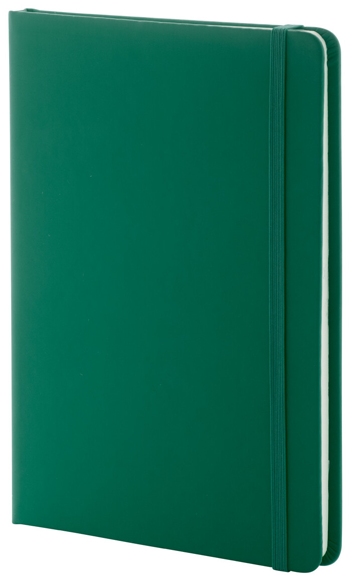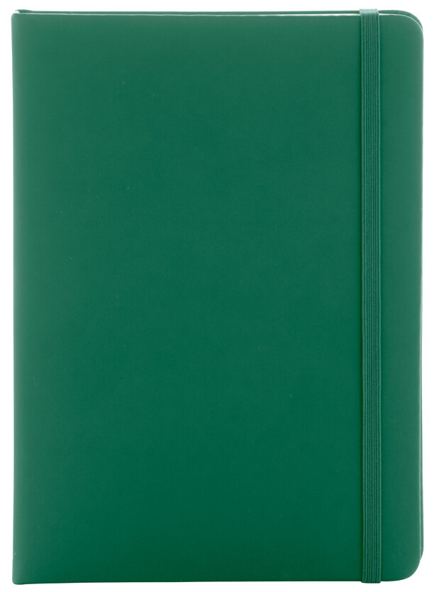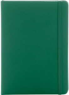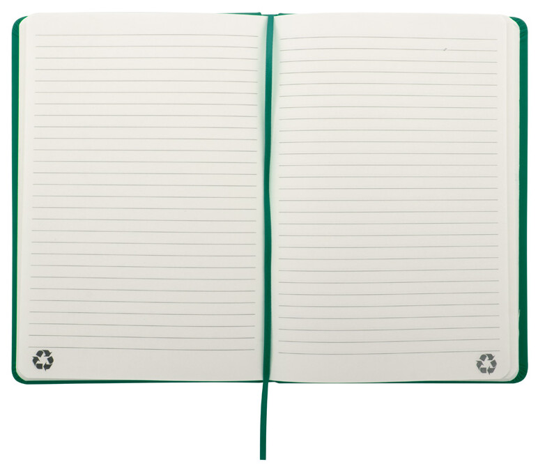 Blok potažený recyklovanou PU kůží se 100 linkovanými listy z recyklovaného papíru. Se záložkou v odpovídající barvě a gumičkou. Velikost A5.