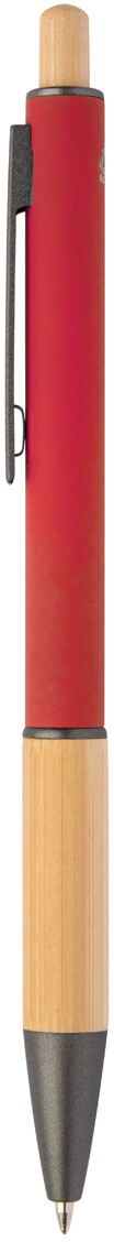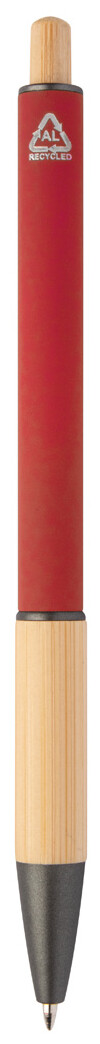 Kuličkové pero z recyklovaného hliníku s bambusovým úchopem a tlačítkem, pogumovaným tělem a kovovými částmi. S modrou náplní.